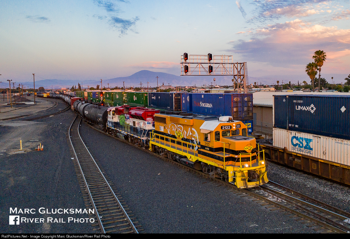 Second Generation Branch Line. On the evening of Tuesday, July 21, 2020, Genesee & Wyoming's San Joaquin Valley Railroad 2122 (BL20-2, EMD, 1992) leads SJVR 3000 (Progress Rail PR30B) and a healthy cut of cars out of Union Pacific's Bakersfield Yard. EMD returned to the BL designation after the GP series, and would build 3 of these 4 axle 2,000 horsepower units as demonstrators on the frames of GP9s. After not producing any further models, they would wind up on the SJVR where they continue to serve today.