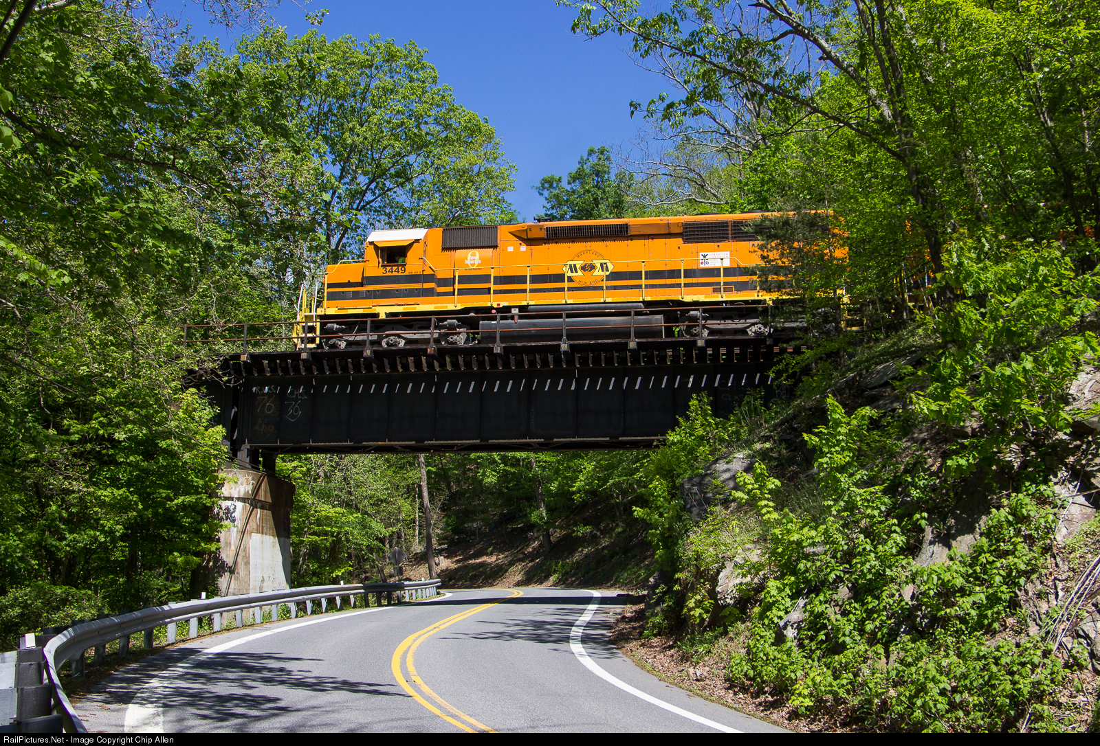 | On a cool, clear spring day, Maryland Midland train UBHF claws up Catoctin Mountain just west of Thurmont on its way to Highfield. The two SD40-2s are on their knees with 21 cement loads and a handful of empties in tow as they cross one of the bridges over Sabillasville Road and Owens Creek. |