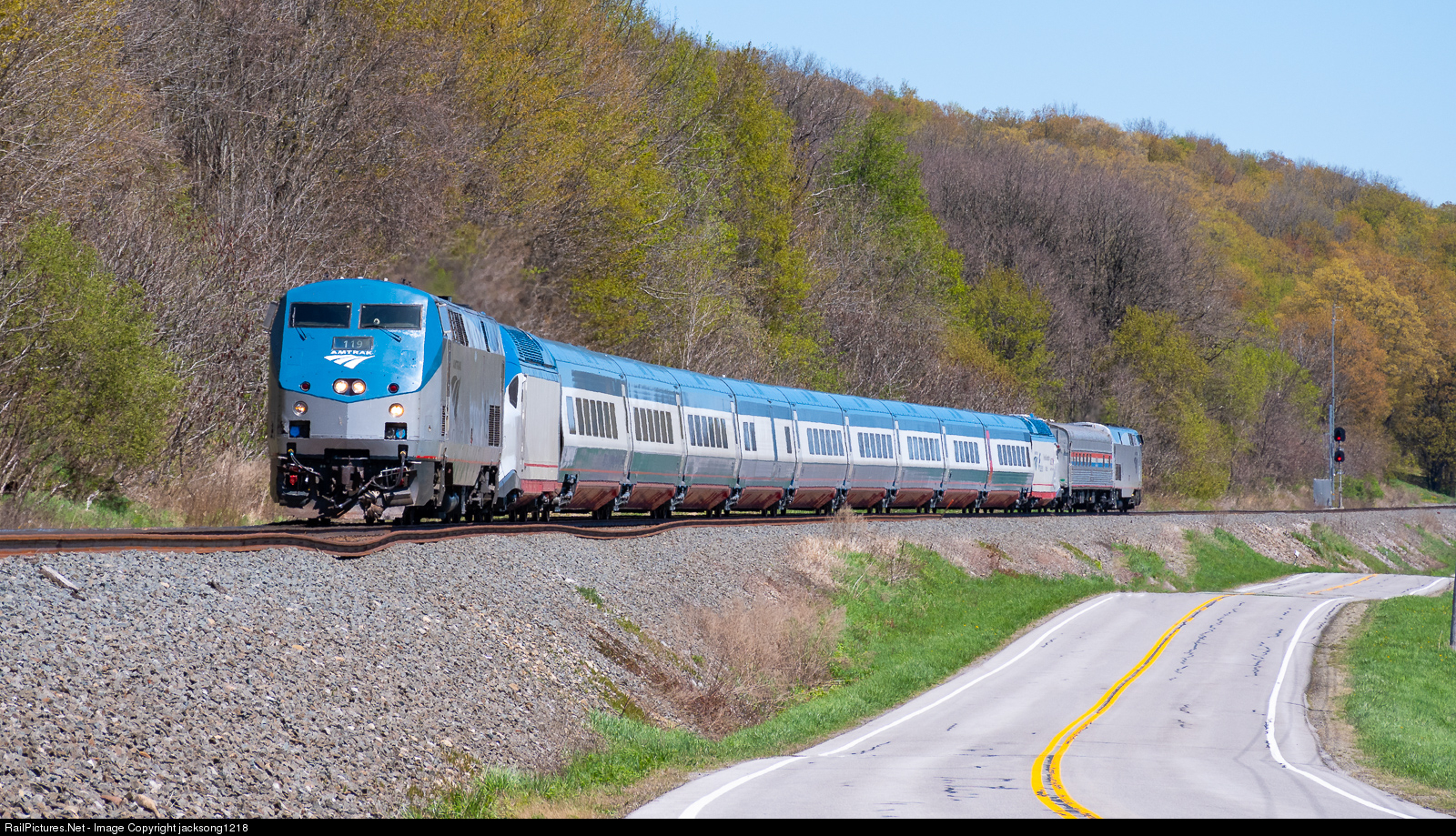 After 14 months of testing in Pueblo, Colorado, the first Amtrak "Avelia Liberty" trainset makes its way back to the Alstom plant in Hornell, NY for final assembly. The train is seen here on the embankment at Dale, NY.