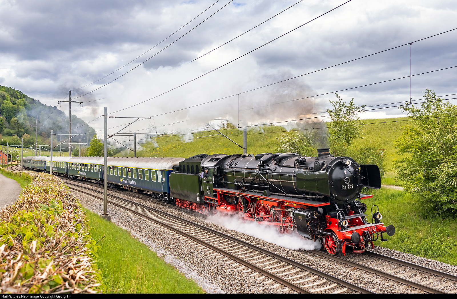 | Former Deutsche Bundesbahn express train steamlocomotive 01 # 202 of the association "Pacific 01 202" in Lyss, is running full steam on the 9 o/oo grade between Eglisau and Glattfelden, pulling the steel blue cars of the "Suisse Train Bleu" and two green cars of association Mikado 1244 in the rear. The train of Zermatt Rail Travel (ZRT) is on a round trip from Lyss via Biel-Solothurn-Olten-Läufelfingen-Sissach to Basel, then via Laufenburg-Koblenz-Bad Zurzach-Eglisau-Bülach-Regensdorf-Brugg AG-Olten-Solothurn-Biel back to Lyss. |