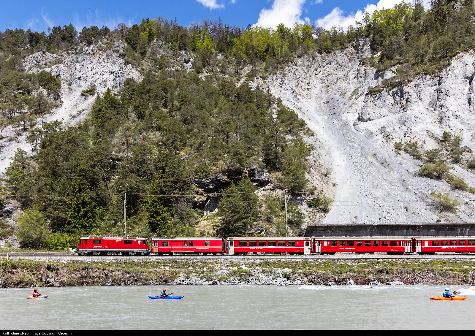 | Ge 4/4 II # 625 of the Rhaetian Railway is pulling the Regio Express 1737 from Landquart to Disentis/Mustér along the Vorderrhein through the Ruinaulta between Trin and Versam-Safien. This river is very popular for canoeing and rafting. |