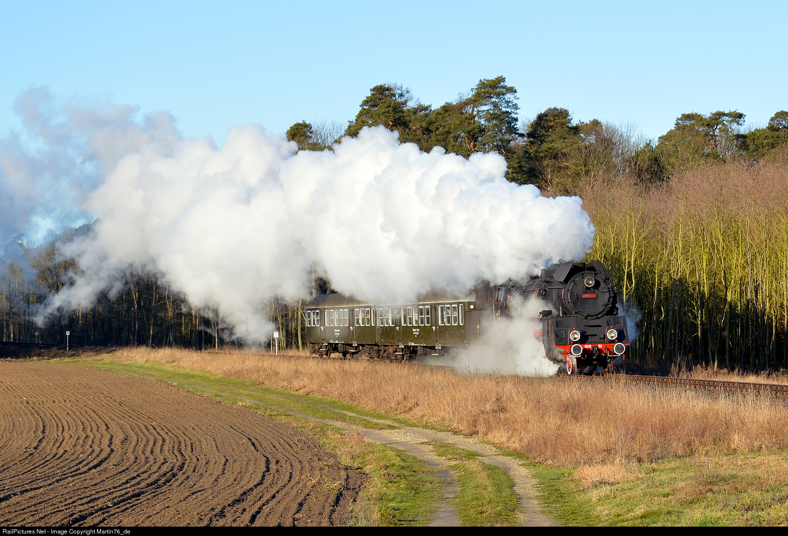 | Morning passenger train from Wolsztyn to Poznań Główny in clouds of steam, he approaches the railway crossing in Trzebaw. |