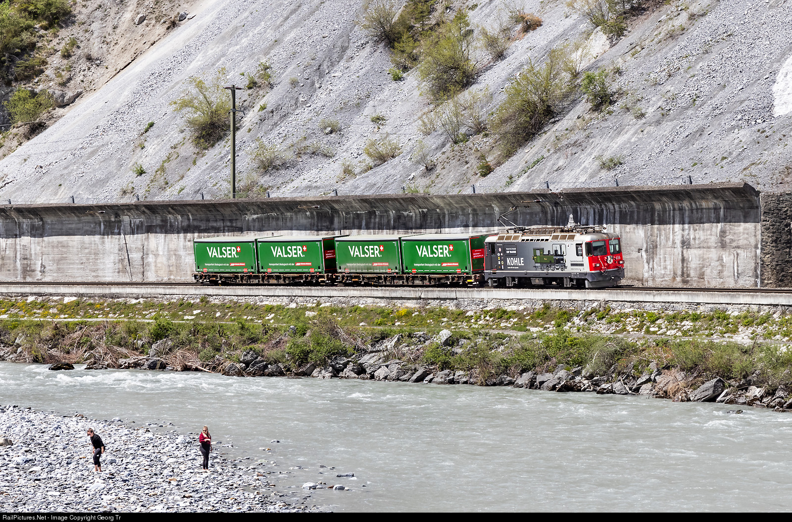 | Ge 4/4 II # 616 of the Rhaetian Railway, in the publicity paint scheme for collecting donations for the steamlocomotive G 3/4 # 1 "RHAETIA", is pulling the short freight 5742 from Ilanz to Landquart, with VALSER mineral water in swap bodies. The train is rolling along the Vorderrhein in the Ruinaulta between Versam-Safien and Trin. |