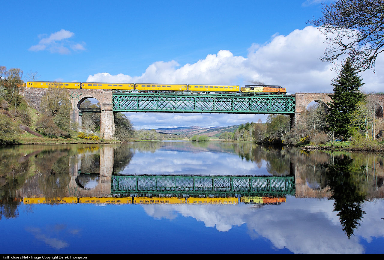 | 37116 with 37219 at the rear cross Invershin viaduct working the 08:46 Inverness Milburn Yard - Thurso - Wick - Inverness Milburn Yard. This test train runs every 12 weeks to the very top of Scotland and adds variety to the normal 2 car units and the very infrequent freight trains that work along the line. |