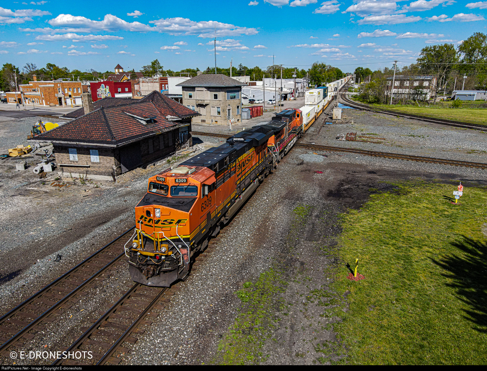 BNSF 6309 leads containers westbound past the Deshler Depot.