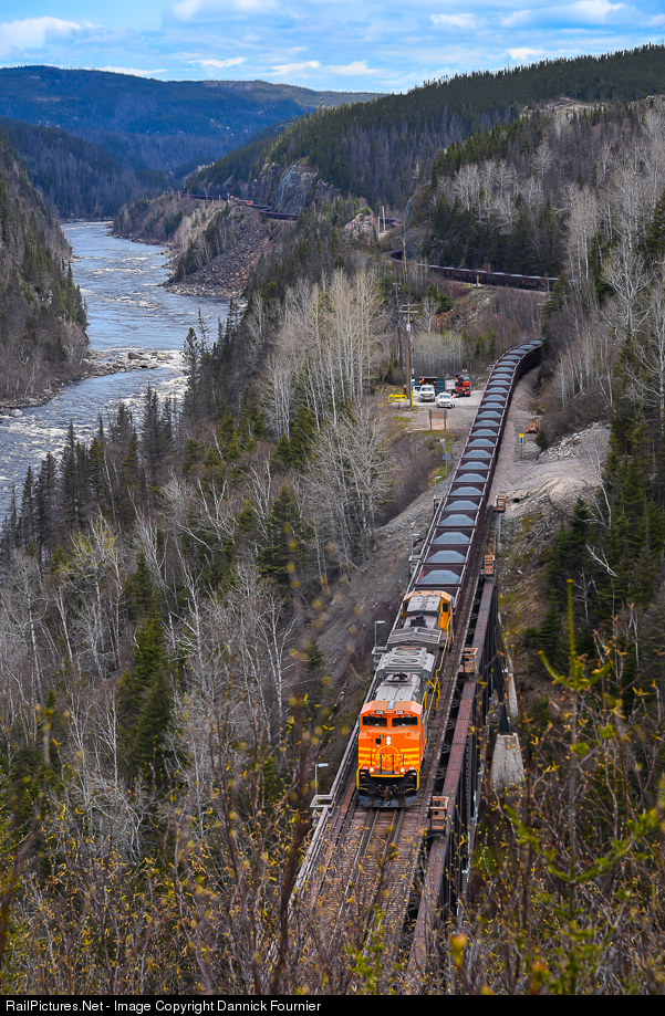 QNS&L 526 southbound with a loaded iron ore train rumbles across the Moisie River