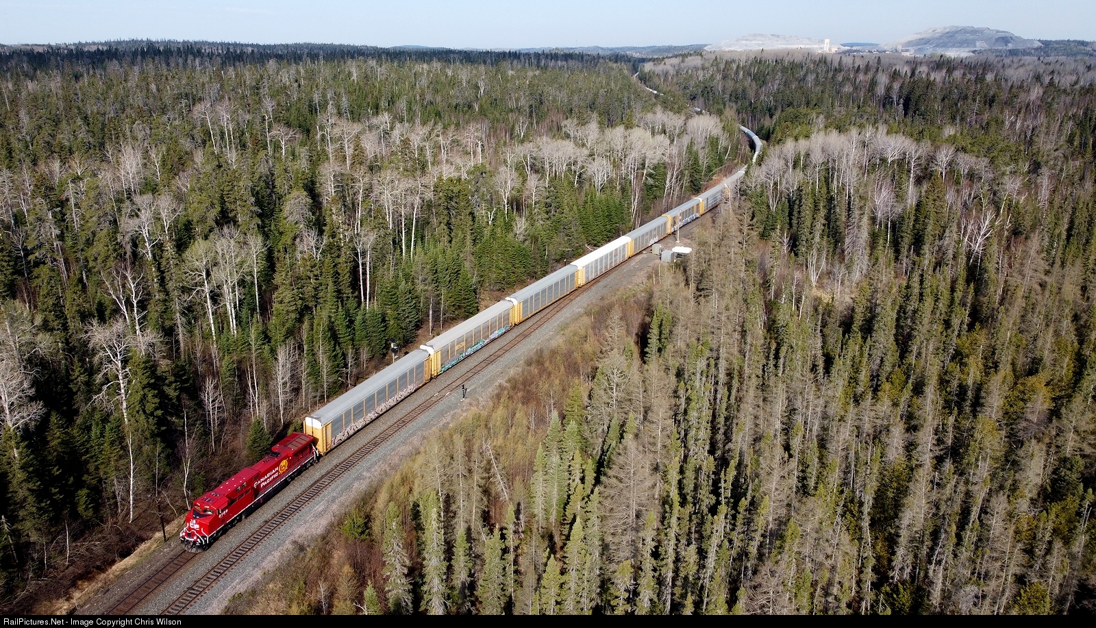 Factory fresh from Texas, CP AC4400CWM 8169 pulls a Vancouver Coquitlam, BC - Toronto Yard, ON vehicle train into Struthers. The Barrick Gold Hemlo mining complex is off in the distance.