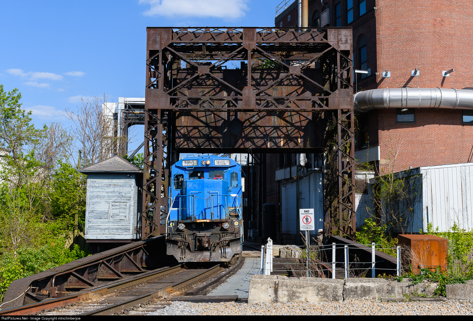 Upon returning to Zanesville, Ohio the Ohio Central's Cambridge Turn broke down their train into the two small yards in town. After dropping some tank cars on the west side of the river, the crew heads back to the yard office on the east side, crossing over a short lift bridge that spans a small canal along the Muskingum River which uses Lock 10 to bypass the dam on the main river channel.