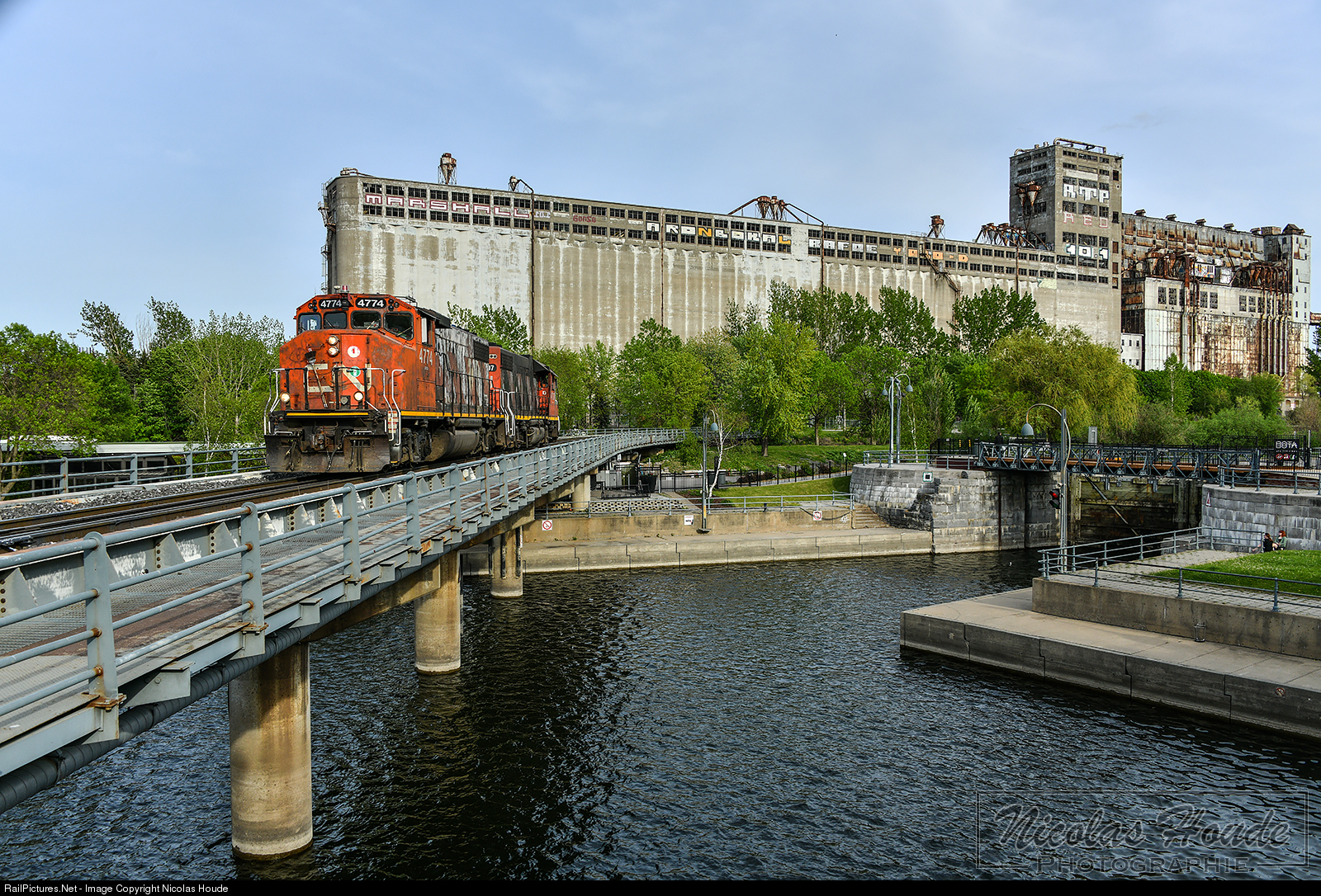 CN L59621 18 is rolling over the Lachine Canal, on its way into the Old Port of Montreal. Coming from Pointe-Saint-Charles yard, CN 596 is going to the port light power, to pick up 107 cars to bring to Taschereau yard. In the background, we see Grain Elevator #5, which was completed in four stages (1906, 1913, 1924 and 1958). Construction on Grain Elevator #5 was begun by the Grand Trunk Railway in 1903. In the late 19th century and for several decades thereafter, grain was the main export product transiting through the Port of Montreal. Competition from U.S. ports was strong, so the decision was made to equip Montreal’s with grain elevators and make it the world’s leading grain port by 1928. The elevator, now owned by the Canada Lands Corporation, has stood abandoned since 1996, and is suffering from a lack of maintenance and has very limited public access.