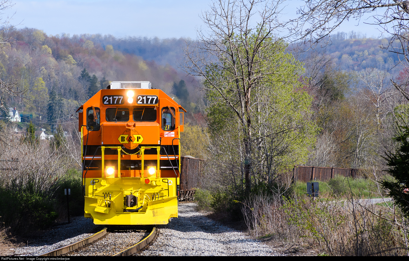 | A Buffalo & Pittsburgh stone extra climbs the grade out of Bradford, Pennsylvania and swings through the s-curve along Industrial Drive on a sunny spring morning. In the lead is freshly repainted ex-NS GP38-2, BPRR 2177. |