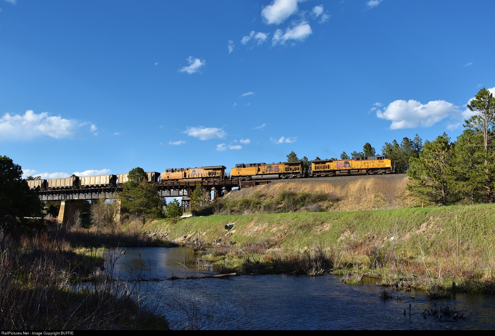 UP 7001 (AC4400CW) leads a 3x2 motor consist pulling a heavy coal train over the Santa Fe Bridge in Larkspur, Colorado.