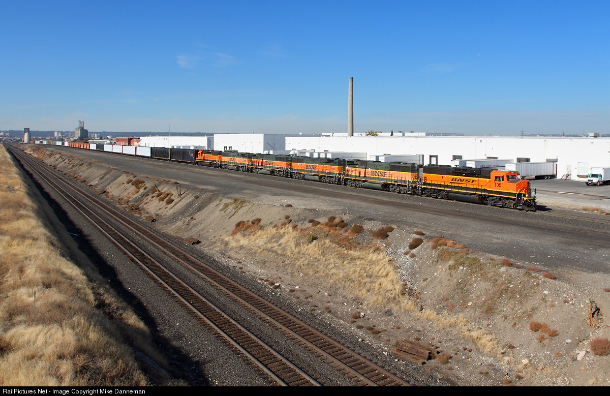 BNSF’s Chewelah Turn nears the end of its run as it approaches Yardley Yard at the Freya Street overpass in Spokane, Washington, on October 11, 2018, powered by an impressive A-B-B-B-B-A consist of GP60M No. 105, GP60B Nos. 331, 335, 344 and 336, and GP50 No. 3120. In the foreground is the railroad’s Pend Oreille Subdivision main line.