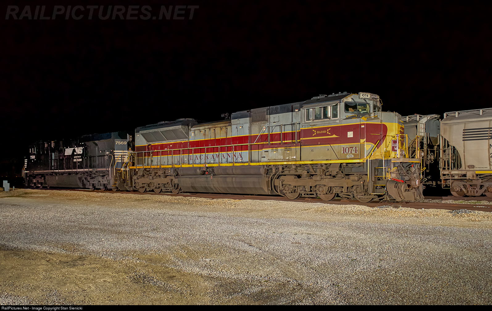 | Looking pretty shabby and neglectid NS 1074 Lackawanna Heritage Unit is posing on the Grand Elk Railroad at White Pigeon, MI. at the Anderson's Grain Facility. |