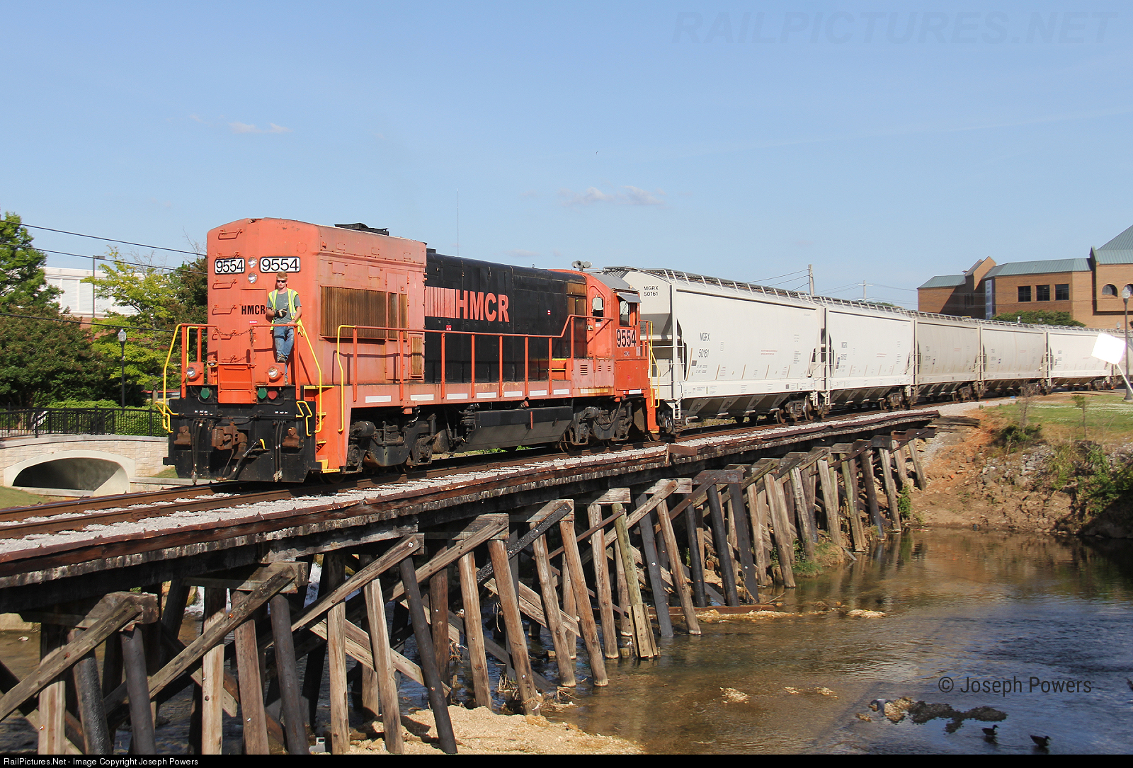 Huntsville and Madison County Railroad Authority's U23B leads a seven car covered hopper train north across the Pinhook Creek bridge in downtown Huntsville, Alabama.