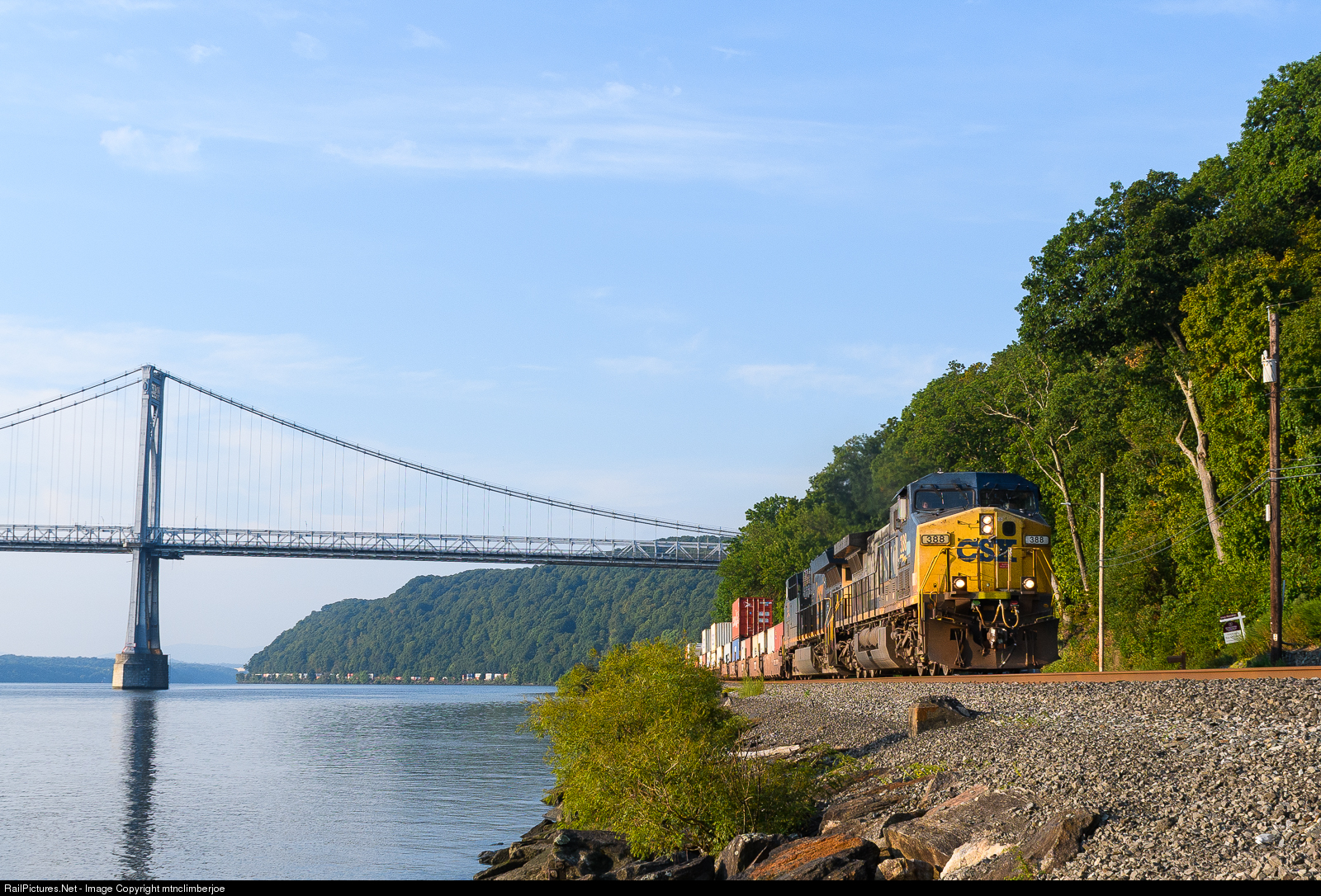With an YN2 AC4400 in the lead, CSX intermodal Q157 heads north on the CSX River Sub, snaking along the west side of the Hudson River. The long intermodal stretches off into the distance as the train passes under the Mid-Hudson Bridge in Highland, New York.