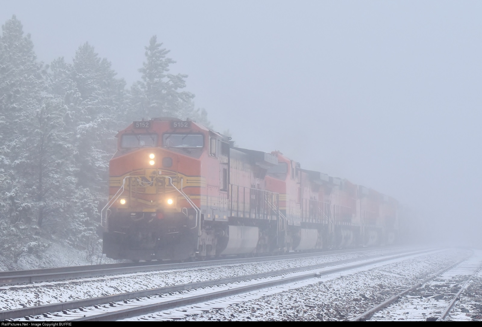 A ghostly BNSF 5152 (Dash9) runs a freight through heavy fog and light snow as it passes Plainview, Colorado.