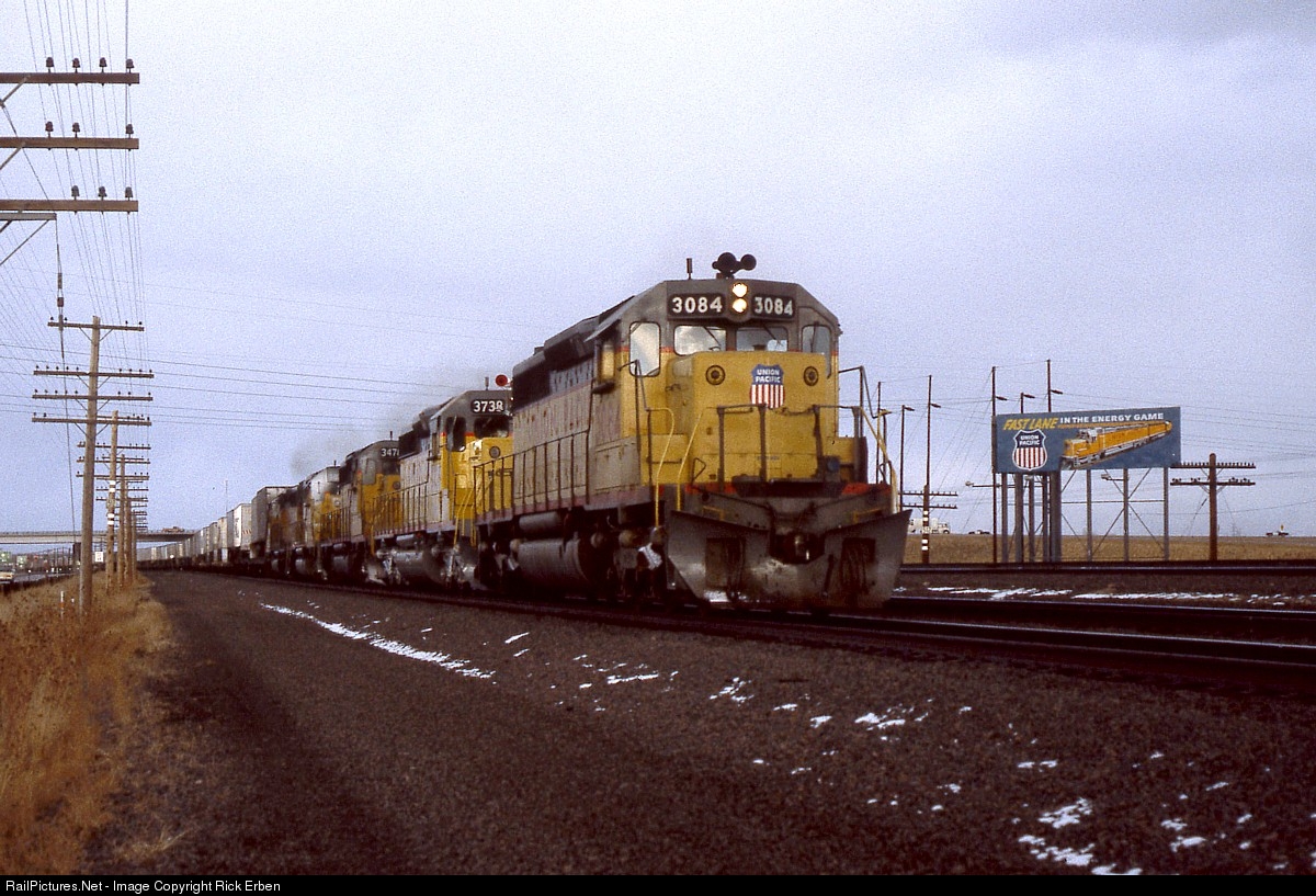 Getting out of town on the fast lane - UP 3084 leads a pack of SD40s as it accelerates out of Cheyenne and into Sherman Hill. With "Great Big Rollin' Railroad" TV commercials and prominent billboards, UP maintained a dynamic presence in the West which this outfit (probably the Overland Mail or VAN) emphasizes.