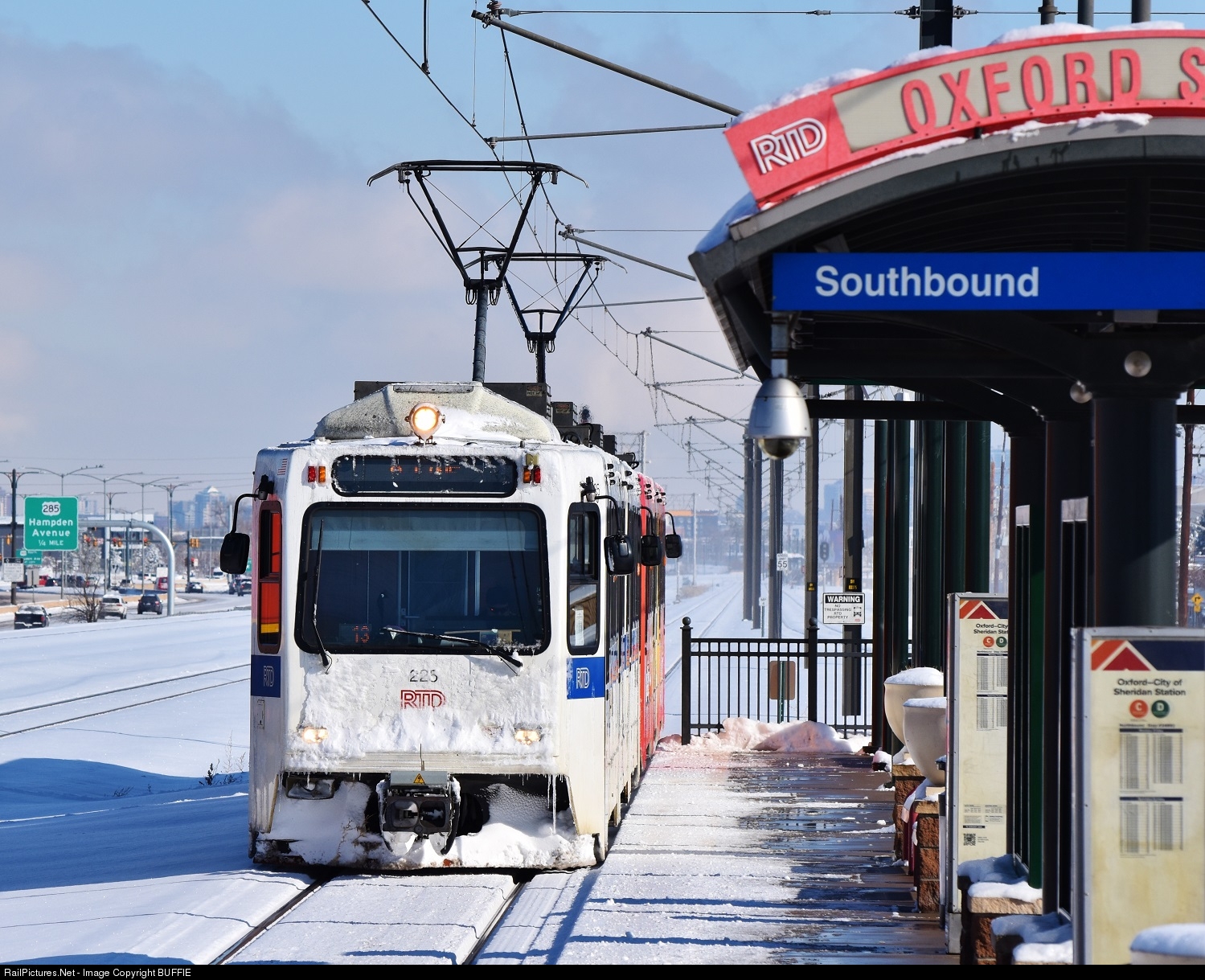 A frosty RTD light rail train #225 pulls into the Oxford Street Station as it heads south towards Littleton, Colorado.