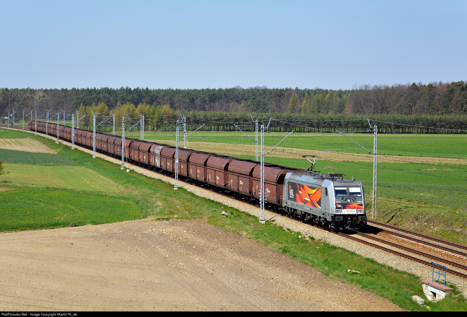 Traxx leased by a private carrier HSL hauling a train with hoppers.