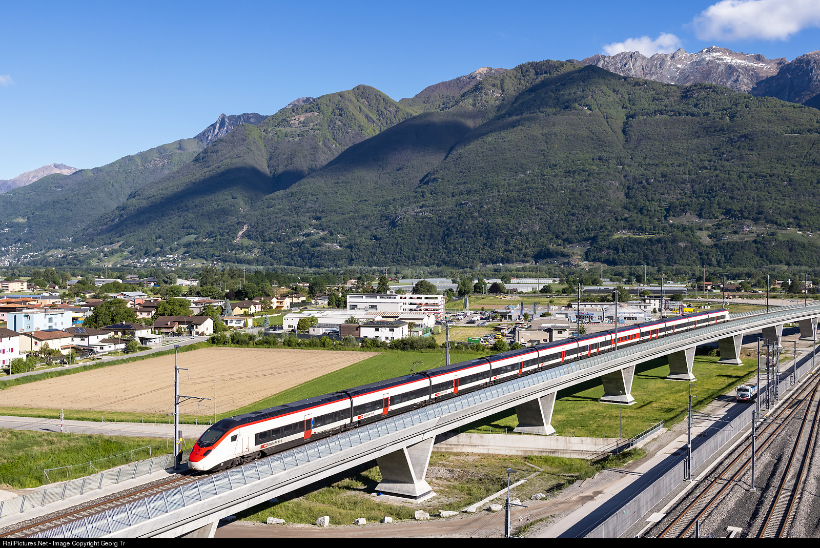 | Above the north portal of the new 15,4 kilometer long Ceneri Base Tunnel (CBT) at Camorino near Giubiasco. Giruno highspeed train RABe 501 # 010 of the SBB is leaving the tunnel and crossing the long bridge towards Giubiasco, running as Eurocity 312 from Chiasso via Lugano-Bellinzona-Arth Goldau-Zug to Zürich. |