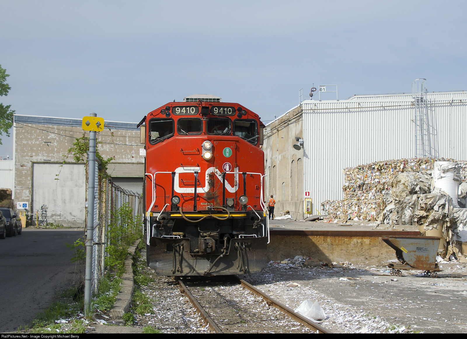 | The Pointe St-Charles switcher is setting off boxcars at the Kruger recycling plant, located at the end of the short Turcot Holding Spur. The conductor can be seen walking back so he can inspect the cars to make sure that they are properly secured and that their are no objects stuck between the cars and the dock. |