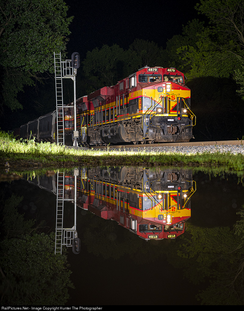 In the middle of the night, a pair of GE units lead a KCS train on its way south through the signals at control point North Watts in Watts, OK on May 26, 2021.