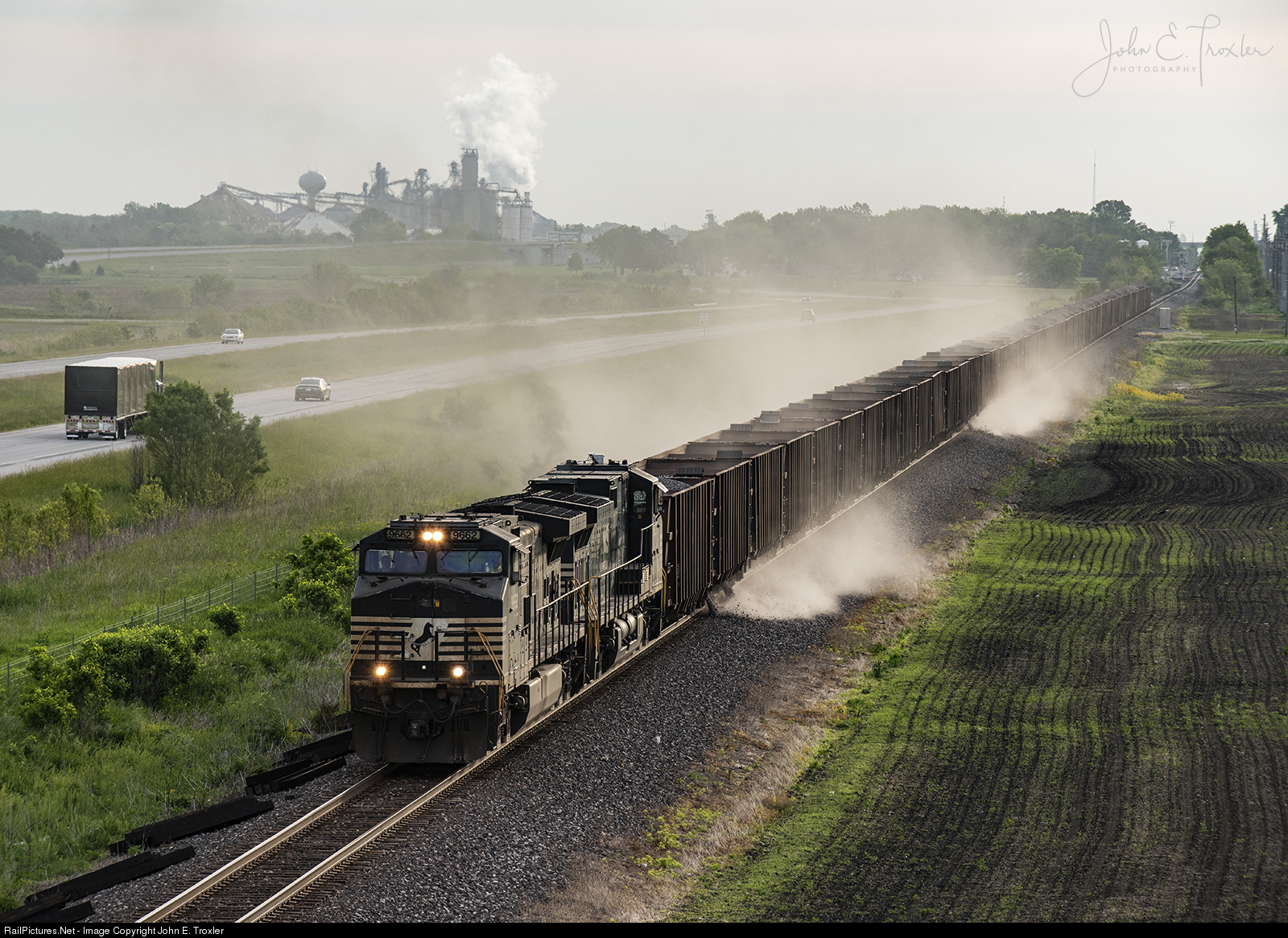 | On my way to work I was lucky to catch a Herzog ballast train dropping ballast on the NS Wabash line located on the eastern edge of the NS Illinois Division, the Lafayette District. The train is shown here a mile west of Clymers, IN. Herzog's automated ballast unloading system provides precision application with no need for workers on the ground. The system can unload at a speed up to 20 mph. |