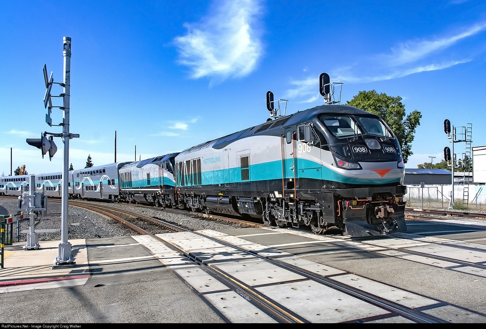 Paired locomotives on Metrolink trains is usually rare, but in this case F125 904 is so new, despite its low number, that it has been teamed with 908 for break-in runs. Both engines were built in May 2016, but delivered years apart: 908 was delivered in January 2017 and 904 was delivered in October 2020 and is not yet ticked off enough miles to be allowed to operate on its own. Seen here on train 609 (Oceanside to Los Angeles), staying on the Orange Sub as it passes through CP Maple (where the 5½-mile-long Olive Sub diverges), seeing these two together allows the opportunity to note some minor differences that show up in these locomotives; the presence or absence of the white sill stripe and the varying locations, and color, of the road number on the cab. (Orange, California – May 28, 2021)