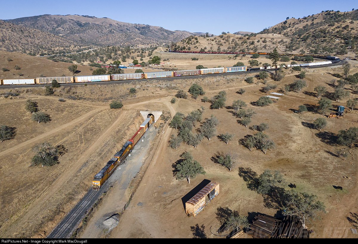 | A UP manifest is seen in various segments on Tehachapi Loop, with their DPUs about to enter the tunnel as the head end meets a BNSF grain train. |