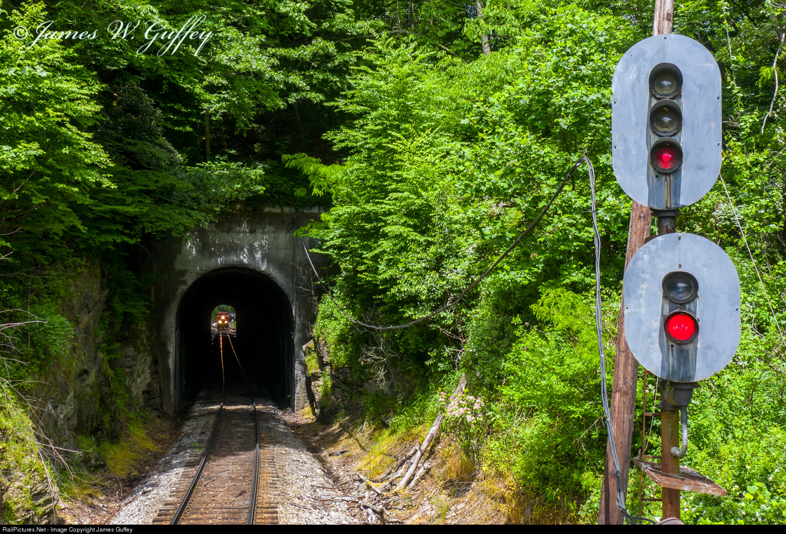 Ethanol loads for Charlotte pass the south end of the Toe River siding and enter Vance Tunnel at Altapass, NC, with the Clinchfield-era signal protecting their move.