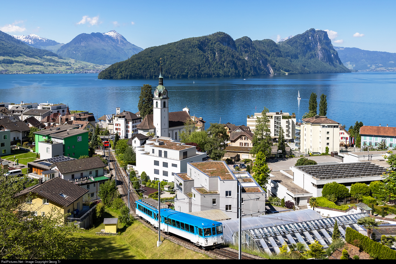 A blue/white train in Vitznau is not usual. The cogwheel trains of the former Arth-Rigi-Bahn (ARB) are not allowed to run on the steeper (25.0 % instead of 20.0 %) grades of the former Vitznau-Rigi-Bahn (VRB), excepting the powerfull (1120 HP) railcar BDhe 4/4 # 15 with cab car Bt # 25 built in 1982. The Vitznau-Rigi-Bahn (VRB) got two red/white trains of the same construction in 1986, BDhe 4/4 # 21 and # 22 with cab cars Bt # 31 and # 32. In 1992 finally, the former ARB and the VRB were joined to the Rigi Bahnen, but the colors are still different. The push-pull train BDhe 4/4 # 15 with cab car Bt # 25 is reaching Vitznau as second train CC 1110 from the Rigi, in the background can be seen the red first train CC 1110, which was BDhe 4/4 # 5 with two cars.