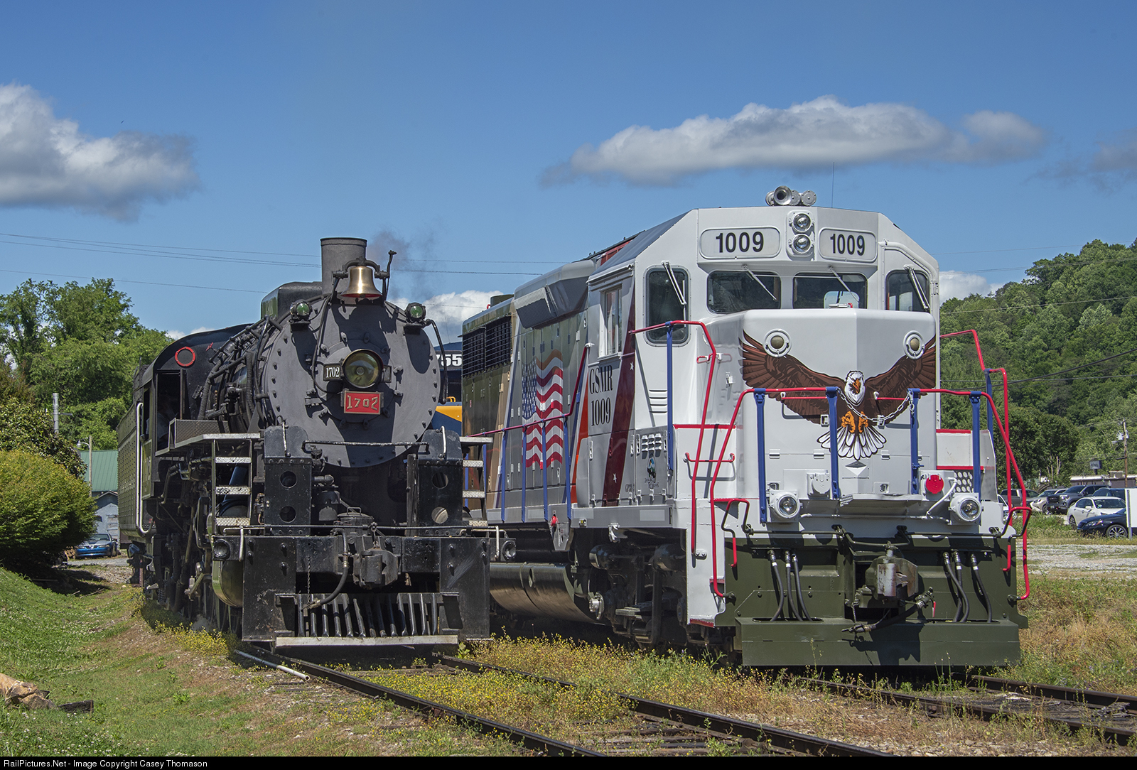 | The Great Smoky Mountain Railway NOC train is arriving back into Bryson City with the former US Army steamer 1702 trailing on the rear, passing their recently-painted Veterans unit. |