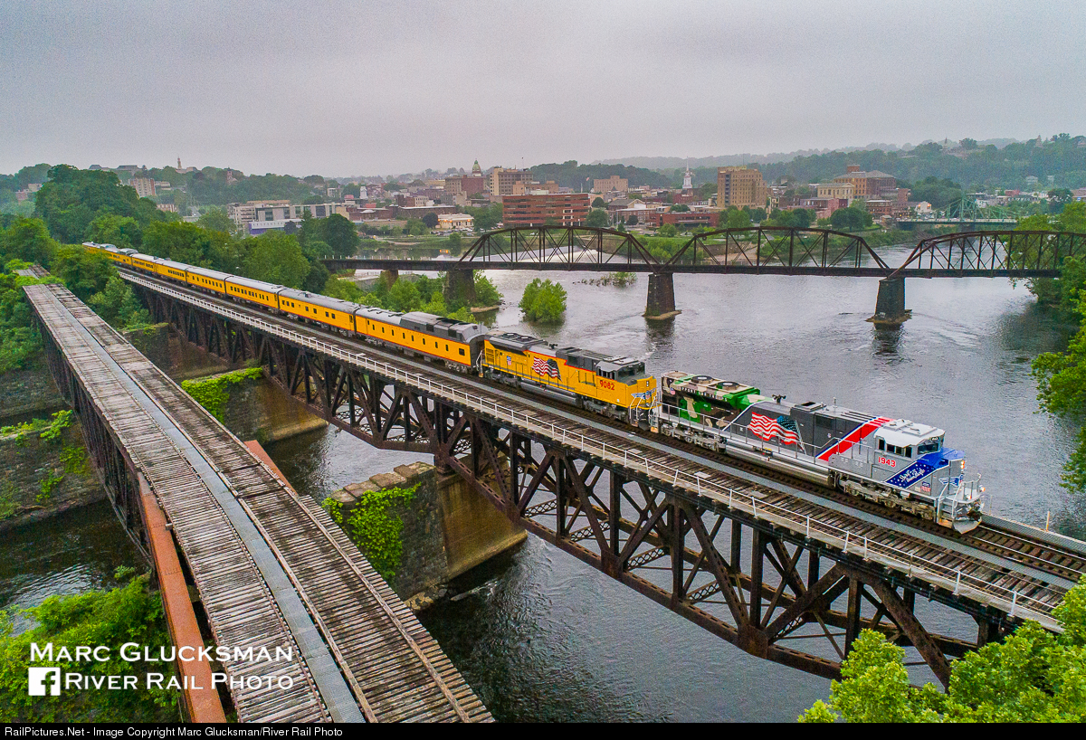 Tribute. In an event that attracted railfans from around the country, Union Pacific Railroad 1943 (Veterans Tribute, SD70AH) lead a office car special on May 31, 2018 (operating as Norfolk Southern Train 066) on its positioning move as it headed to Croxton Yard in Jersey City, New Jersey. The main event was a few days later as it made round trip from Croxton to Campbell Hall, New York before returning west. The train is using the former Central Railroad of New Jersey (CNJ) bridge to cross the Delaware River from Easton, Pennsylvania to Phillipsburg, New Jersey. In the foreground is the now out of service former Lehigh Valley Railroad right of way, in the background the former Lehigh & Hudson River span, which still serves today.