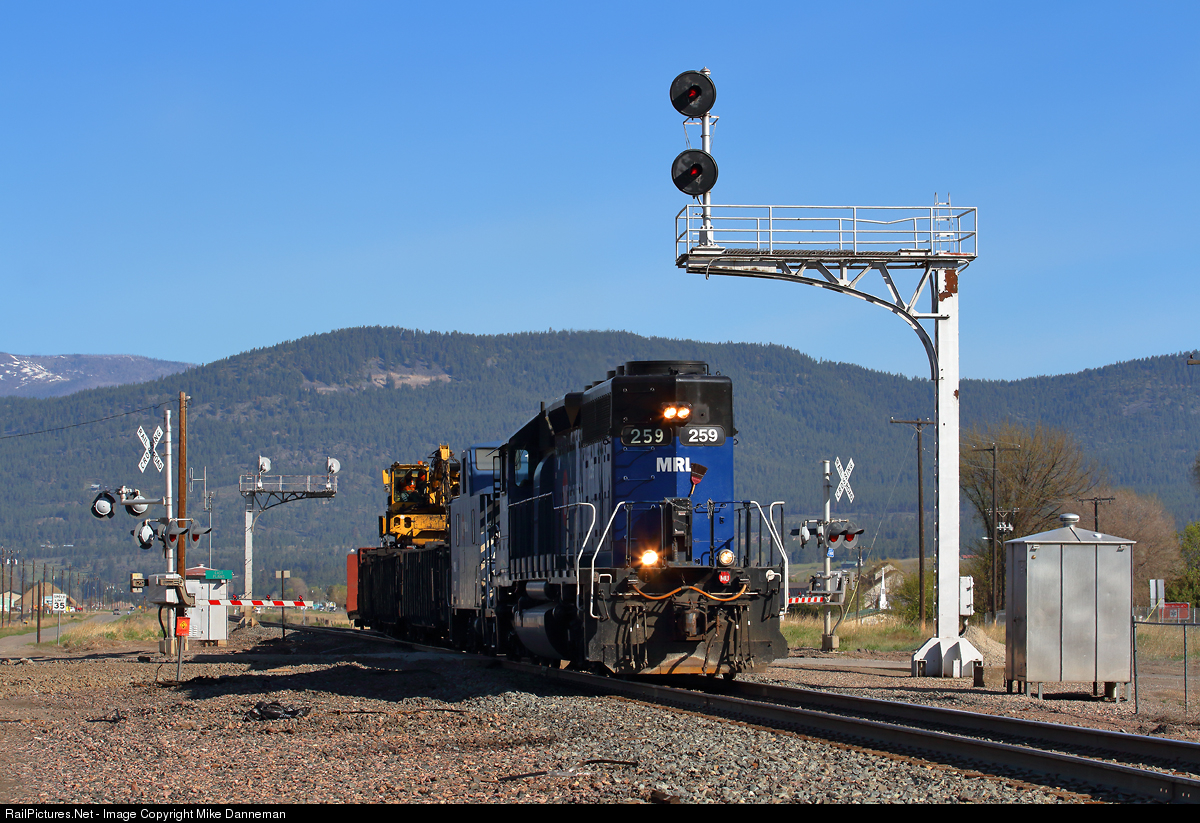 A Montana Rail Link “Jimbo” work train slowly departs the siding at Plains, Montana, and begins picking up old ties laying along the right-of-way after the passage of a tie gang on May 12, 2021. How much longer are the Northern Pacific-era cantilever searchlight signals going to last on MRL?
