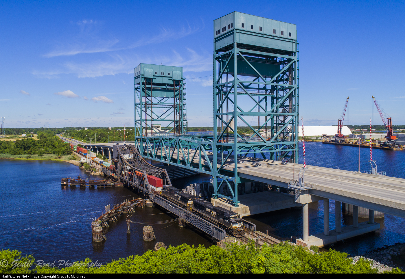 | 23G (Louisville, KY-Norfolk, VA NIT) nears the end of it's journey as it crosses Bridge 7 next to the massive Gilmerton lift bridge which carries US 13 and US 460 across the Southern branch of the Elizabeth River in Chesapeake. |