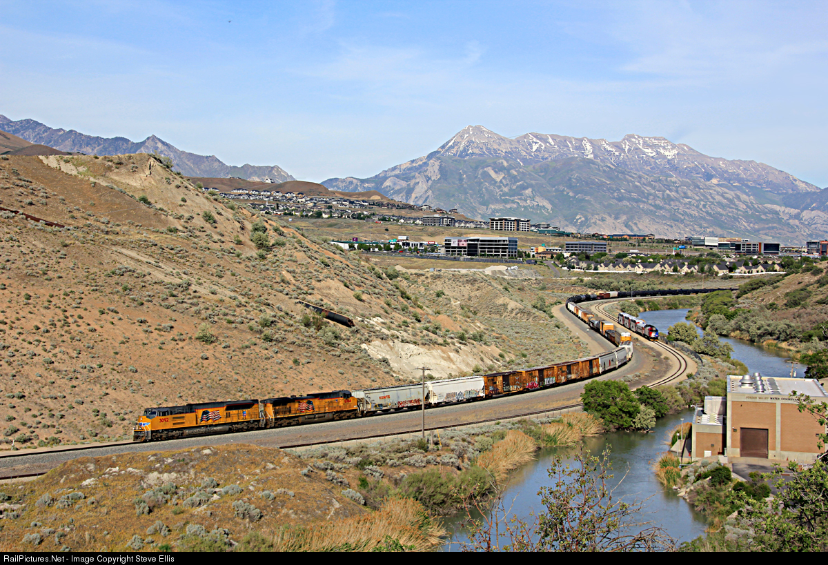 This MWCNP-30 ran up the Sharp Sub then on to the Provo subdivision into Salt Lake City. Lead by EMD SD70ACe-T4 3092. I watched it's progress all day, with the hope of catching it when I got off work. It flew across the Sharp Sub. When I got off work, I took the gamble that I could get to one of my favorite shots the Jordan Narrows (Mesa). I probably wouldn't have made it, but they stopped him in American Fork five miles from my location. I found out he was stopped for some welders on the rail. So I end up waiting for him for over two hours. In what I originally thought would be a quick shot. Fortunately when he did come, Front Runner number 4 decided to get in on the action. The train consisted of Union Pacific 3092 6764 rear end DPU 8964 and 144 cars.