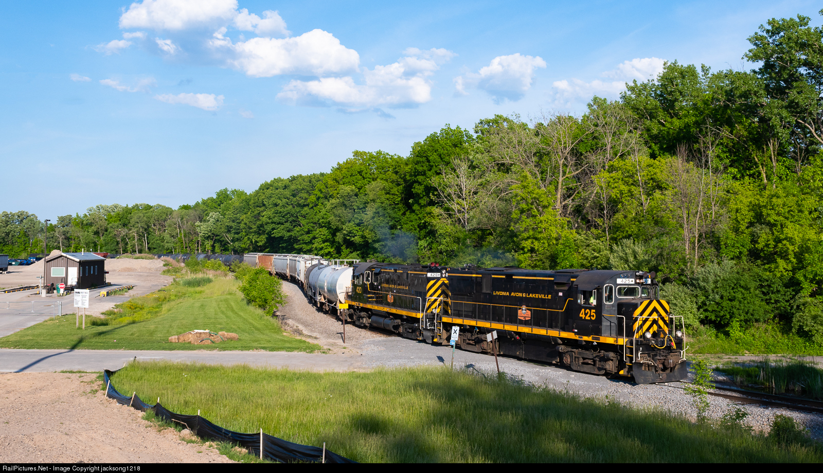The southbound Livonia, Avon and Lakeville road freight slowly works its way around the tight curves in Henrietta, NY with ALCo C425 number 425 leading. This section of track is in place to take the train from the ex Lehigh Valley Rochester Branch alignment to the ex Erie alignment.