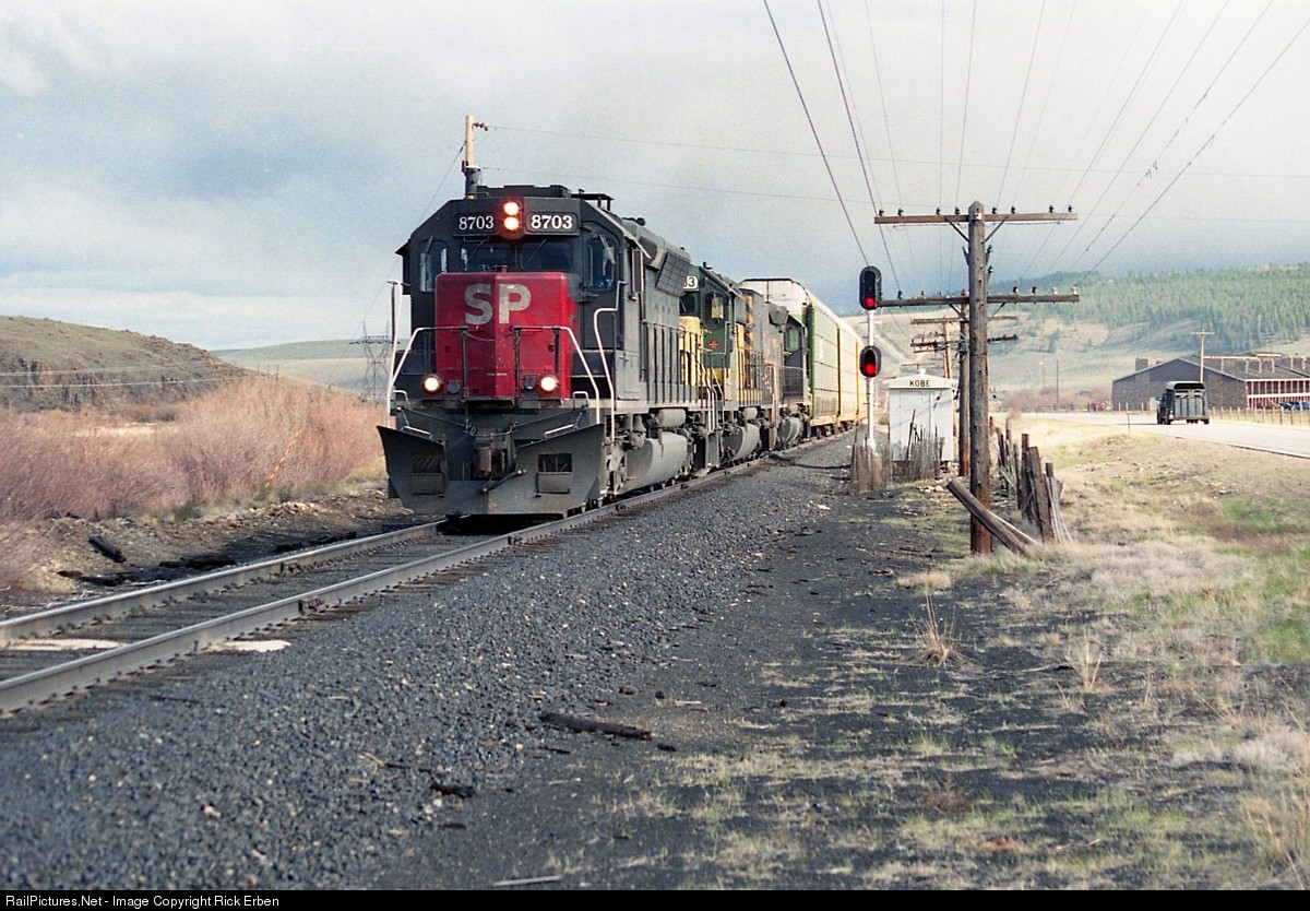 Spring thunderstorms hover about the mountain slopes as SP 8703, C&NW 6933 and D&RGW 5410 handle symbol AHNOA-23 through Kobe, CO in the waning days of service across the Tennessee Pass route. This Herington, KS to Oakland, CA train came across the traditional feeder for the Tennessee Pass route - the former MoPac line across Kansas and eastern Colorado to Pueblo, itself abandoned with the elimination of this line as a through route. Kobe is about 17 miles east of Tennessee Pass.