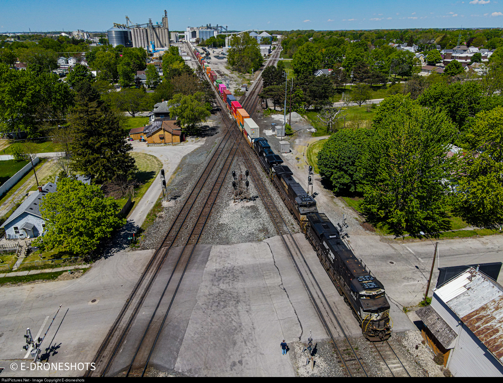 | Pounding over the “B&O” diamond at Fostoria, this eastbound NS train just waited for 6 CSX trains to cross and has finally been given the signal to proceed. |