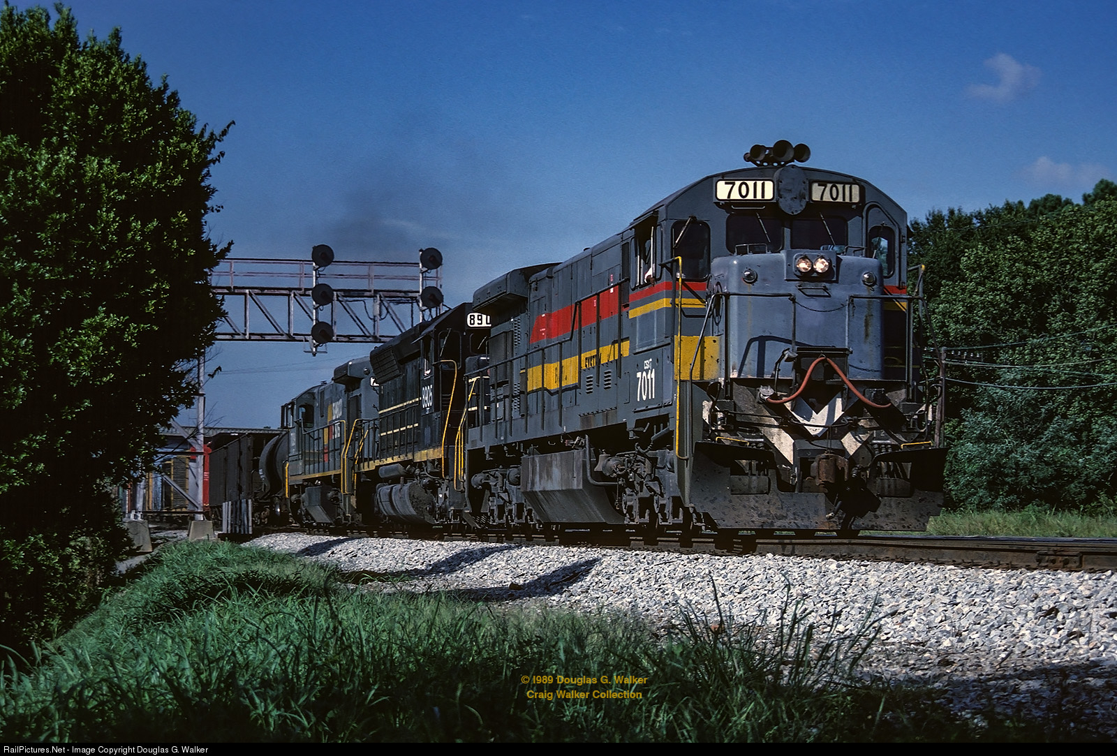CSX has been a railroad for just over three years as C30-7 7011 leads a train southward out of the yard in Fayetteville. CSXT 7011 is the former Seaboard System 7011, and before that Louisville & Nashville 7011 (delivered in the Family Lines scheme still adorning the 7011). It is leading CSXT 8905, an SD45 still in Seaboard Coast Line colors, and another C30-7 in Seaboard System’s livery. (Fayetteville, North Carolina – August 1989). Douglas Walker Photo, Craig Walker Collection