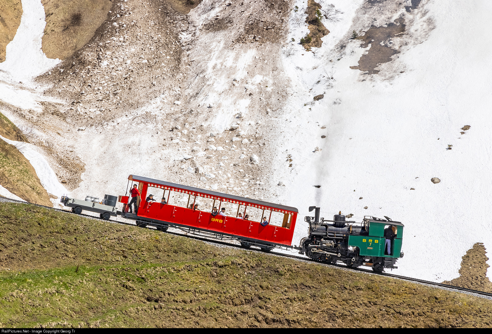 | Steamtrain of the Brienz-Rothorn Bahn (BRB) with coalfired cogwheel locomotive H 2/3 # 7 (built by SLM in 1936), passenger car B # 16 of 1933 and freight car M # 3, running on a grade of about 25.0 % over the Chüemad (cow meadow) between Planalp and Oberstaffel. This was a P.M. photo charter, the line was not open yet til the top of Brienzer Rothorn due to much snow. |