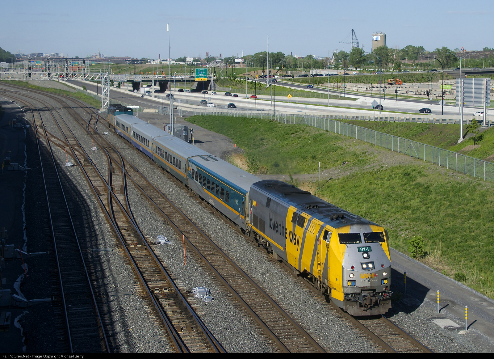 VIA 37 is passing Turcot Ouest with VIA 914, four LRC cars and VIA 6433.