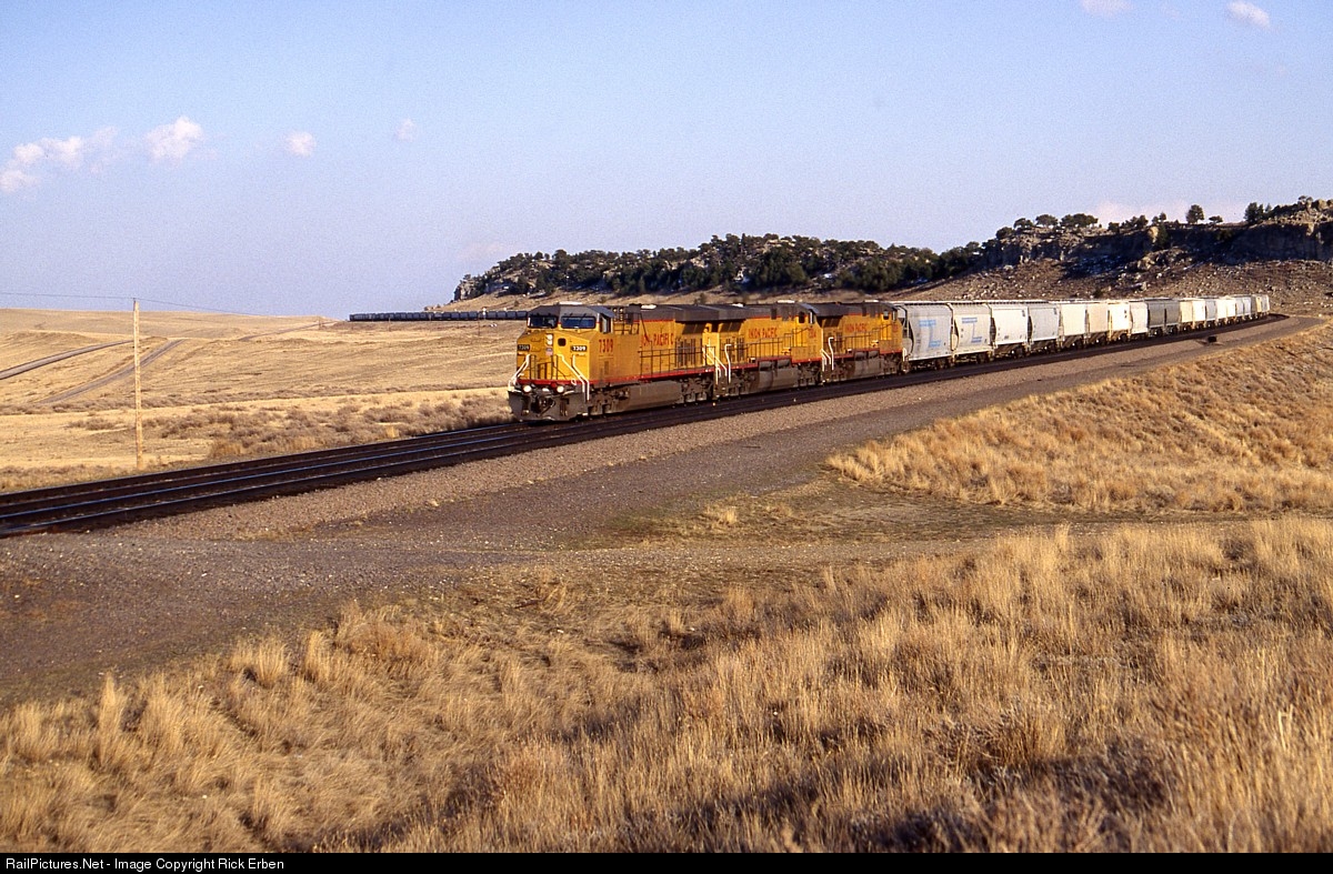 Forever West: A long string of empty covered hoppers for soda ash loading are returning to Green River, WY as the train rolls down the grade from Lookout toward Rock River near MP601. A pre-Interstate era stretch of divided highway on US30 is absent of traffic in this vast expanse west of Laramie, but traffic on the Overland Route is steady, under Wyoming skies.