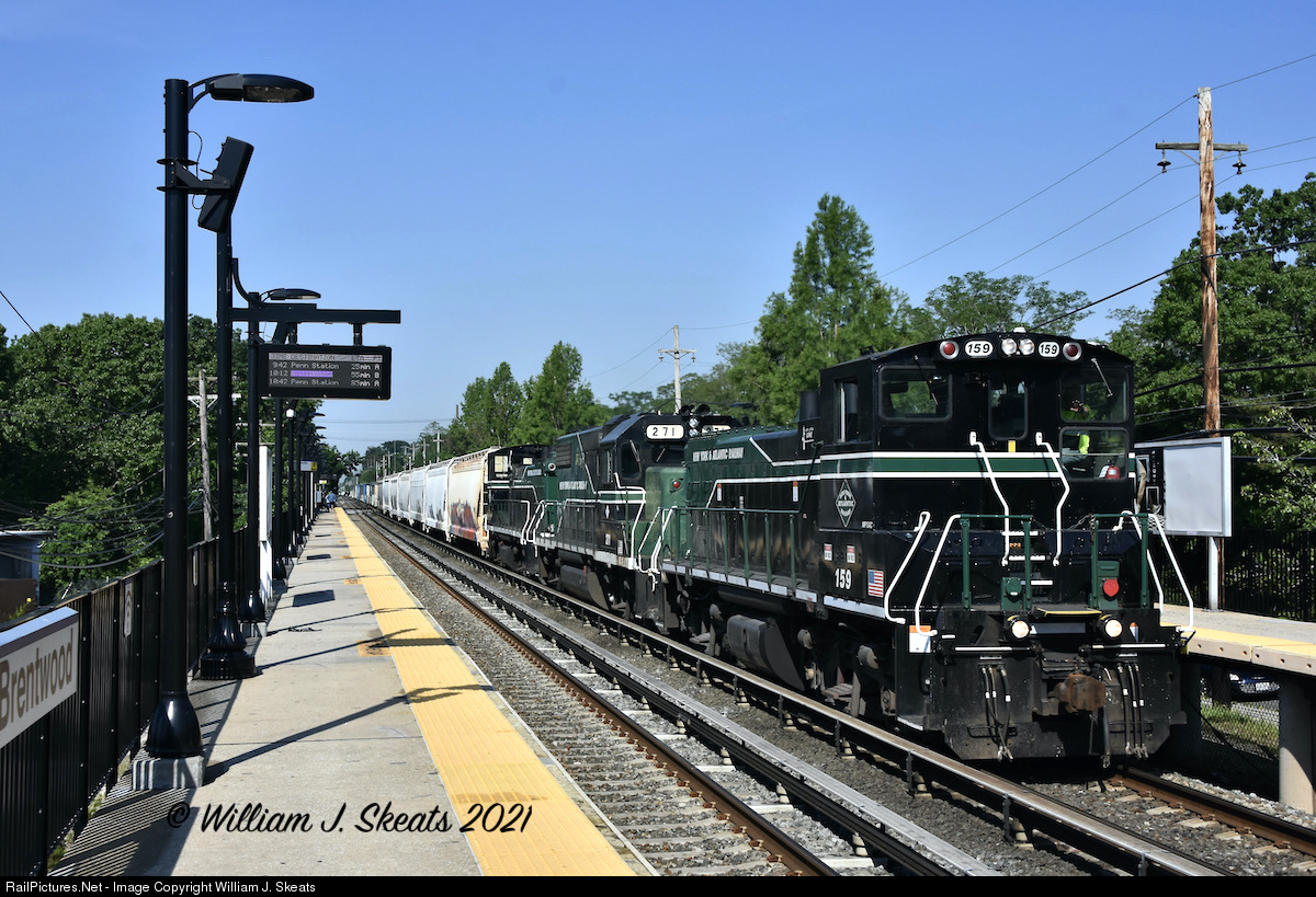 | Rare day time move to Eastern Fence in Calverton. MP15AC 159, GP38-2 271 and MP15AC 156 have 25 cars in tow through the LIRR Station in Brentwood. The crew will switch out 6 empties for 7 loads of plastic pellets. Last 15 cars of stone for Posillico East in Holtsville. |