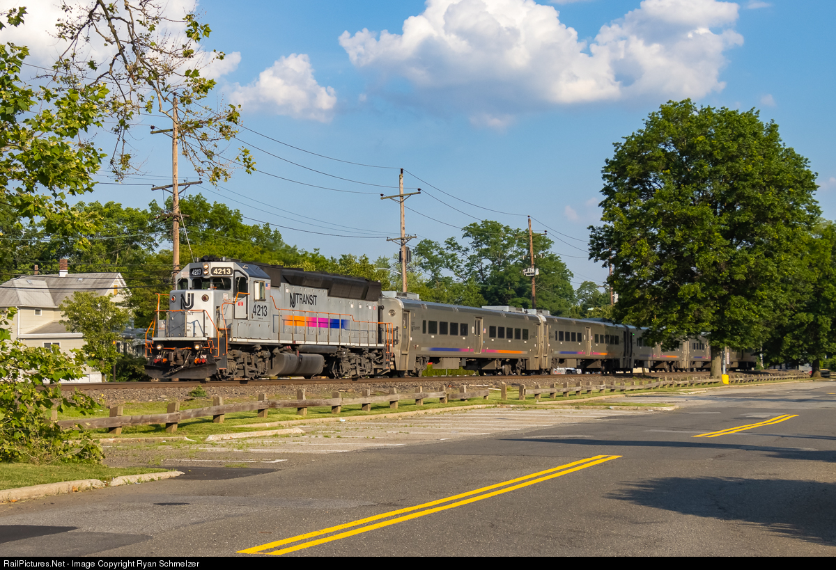 | 4213 is one of only two GP40PH-2 locomotives on NJT's roster to wear the horizontal speed stripe paint scheme. Here it is seen leading a train to Spring Valley, NY though Westwood, NJ. |