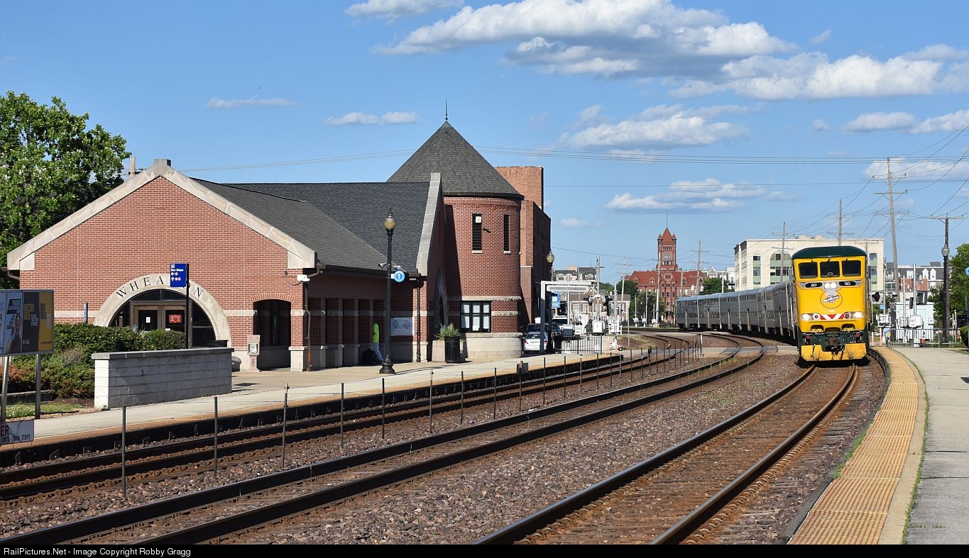 Metra's CNW heritage unit arrives into Wheaton with a outbound train.
