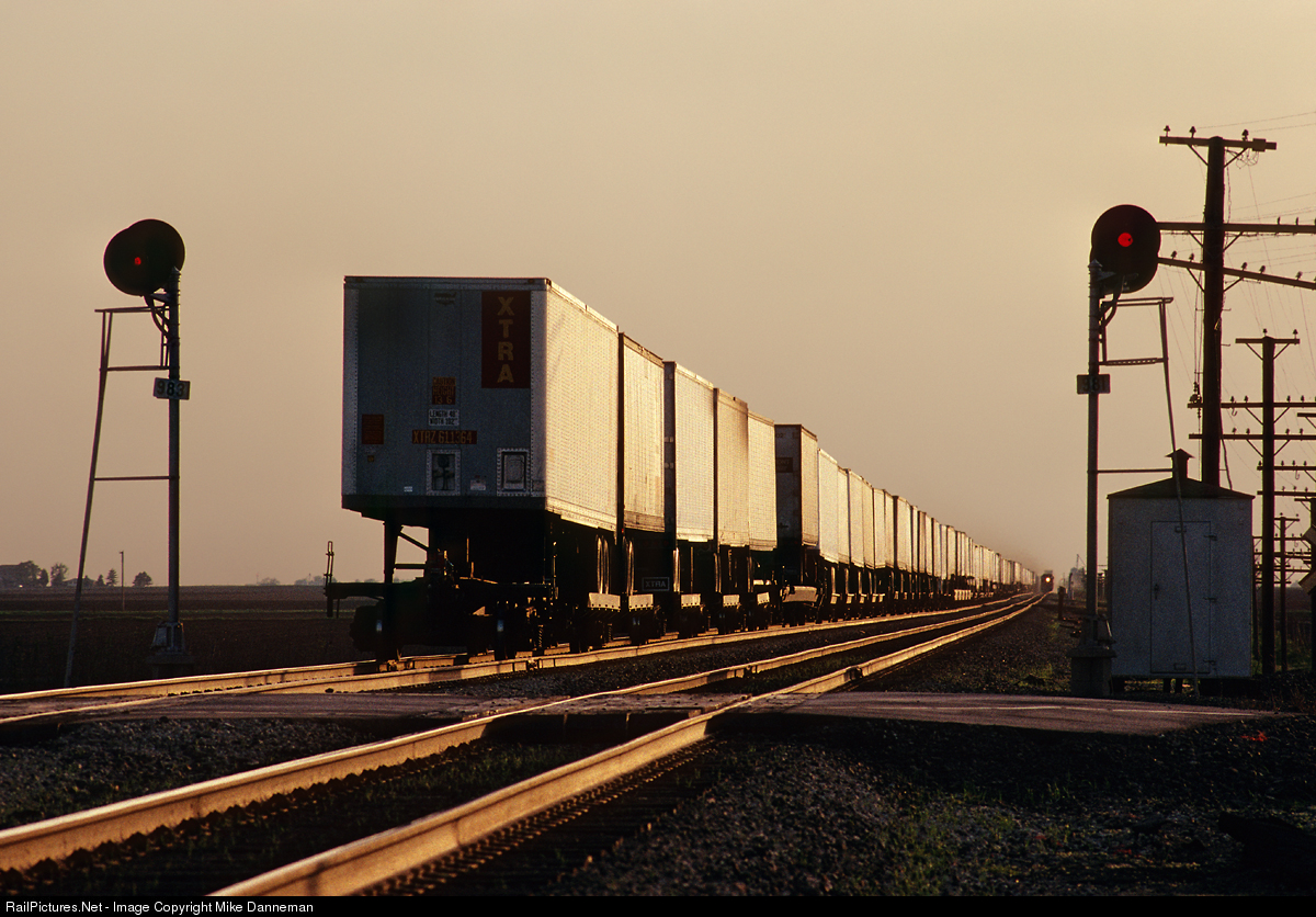 Headlights dimmed between speedsters Two Santa Fe trains pass at a combined speed of 140 mph, as the 198 train meets another of the railroad’s intermodal speedsters, raising dust of freshly-plowed farmland lining Santa Fe’s busy main line between Ancona and Leeds, Illinois, on May 9, 1992.