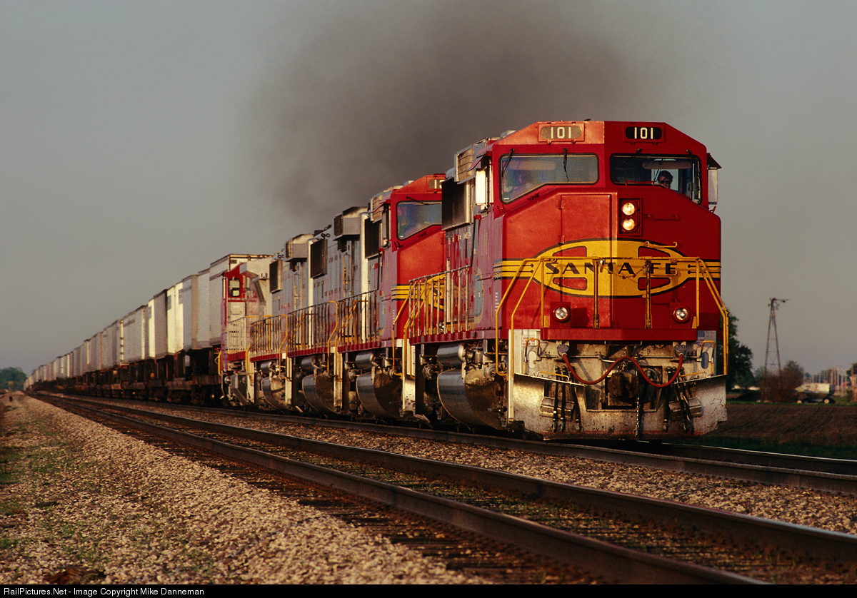Hot rail at milepost 98 Santa Fe’s 198 train, running fast from Chicago to Los Angeles, storms by milepost 98 between Ancona and Leeds, Illinois, at 7:17 p.m. on May 9, 1992. The train has an A-A-B-B-A set of power (albeit with a GE B40-8W spoiler trailing) with GP60M No. 101 on the lead, its headlights dimmed for a meet with an oncoming train.
