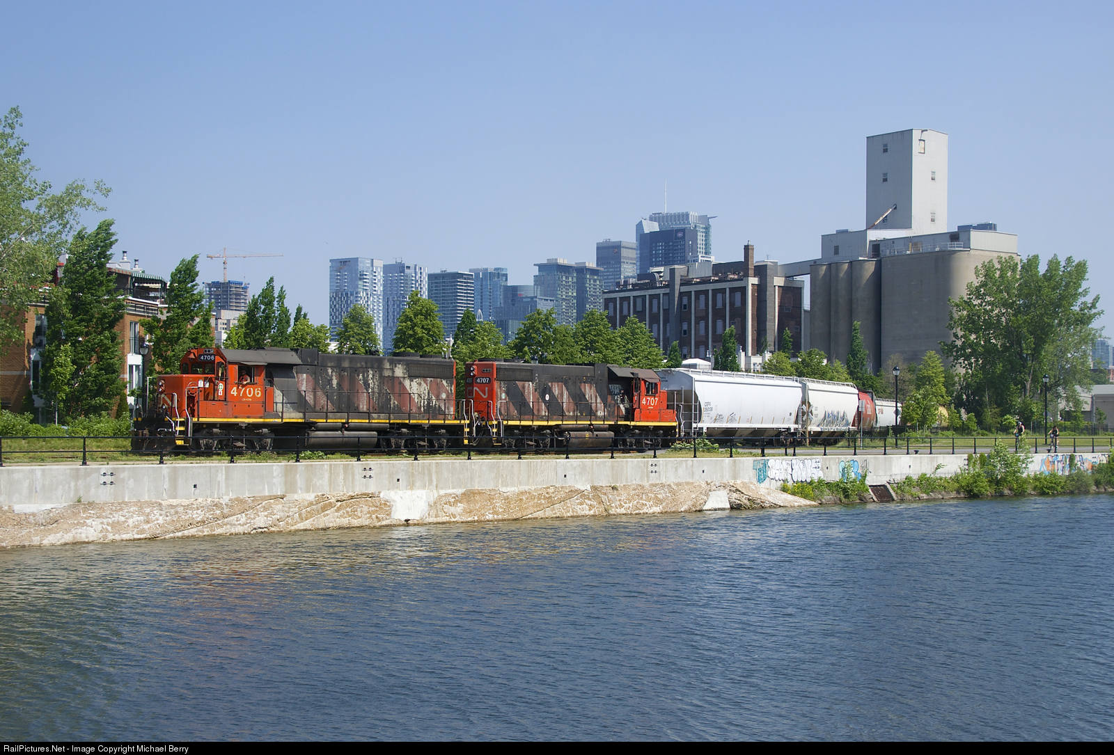 | Consecutively numbered GP38-2's (CN 4706 & CN 4707) are shoving seven cars towards the Ardent Mills at right. Six of them are grain loads for the mill, while the first car behind the power is for O-I Canada, where this train will go when they are done here. |