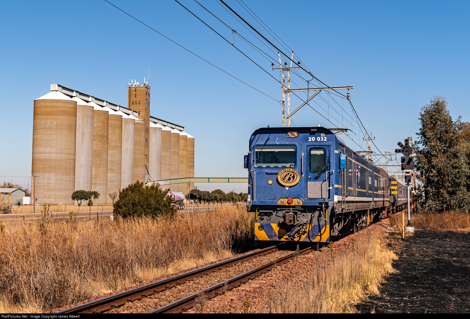 | The luxurious 'Blue Train' headed by two class 20Es (specifically painted for the Blue Train) and a single GM class 34, pass through Regina with a regular train from Cape Town to Pretoria. Due to extensive cable theft in and around Pretoria, the single class GM 34 behind the 20Es will take over at Union station. |